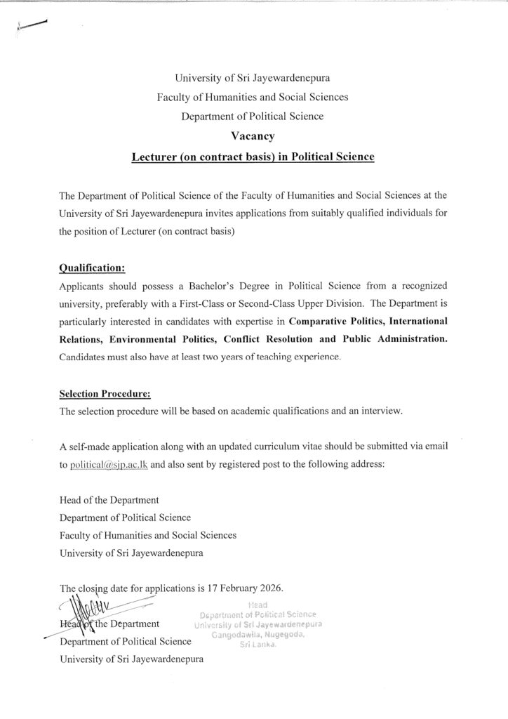 The Department of Political Science of the Faculty of Humanities and Social Sciences at the University of Sri Jayewardenepura invites applications from suitably qualified individuals for the position of Lecturer(on contract basis).