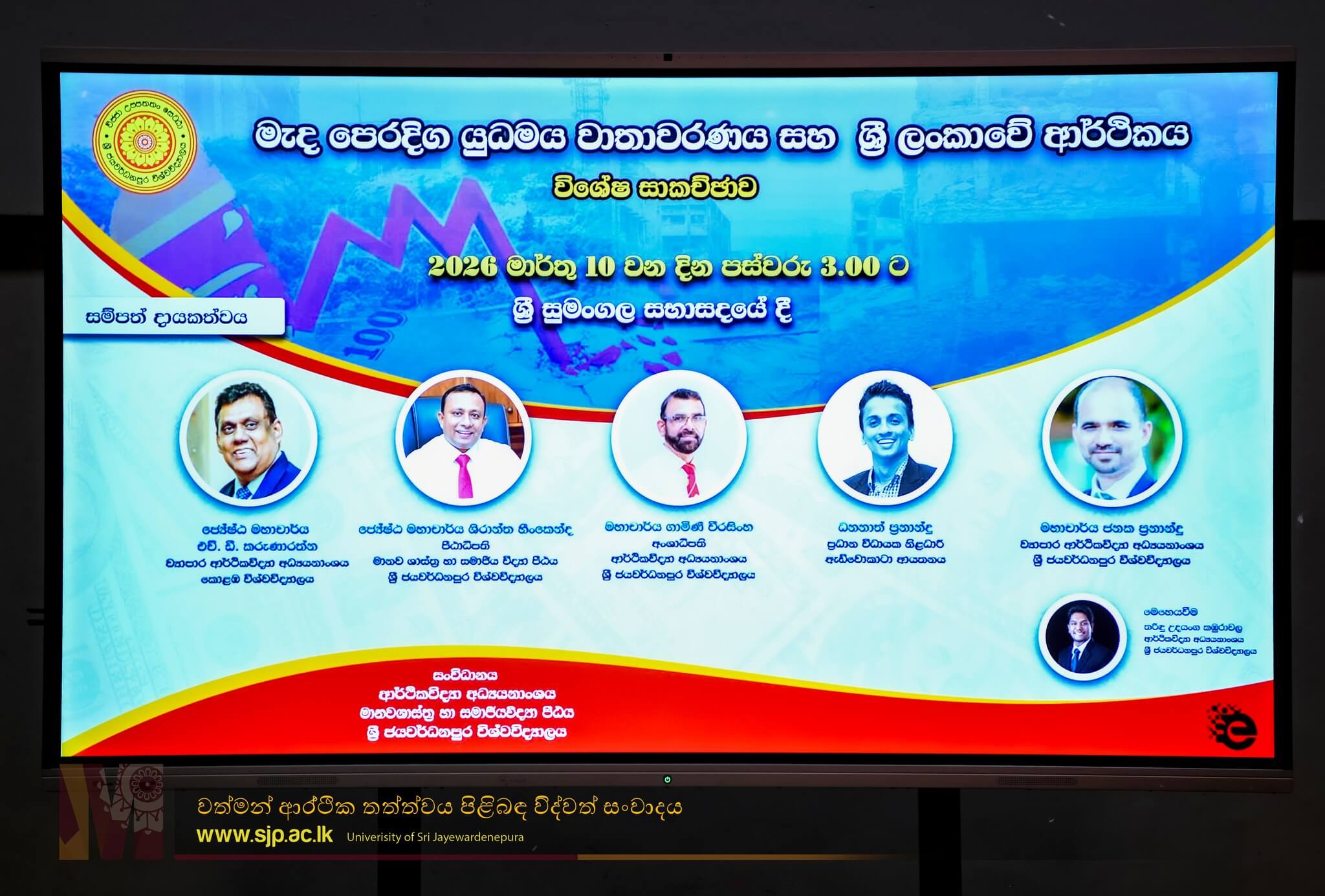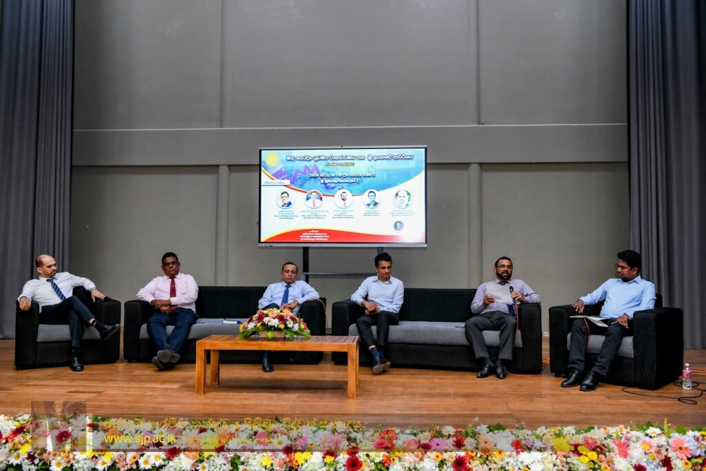 The Department of Economics organized a panel discussion on “The Crisis in the Middle East and the Sri Lankan Economy” on 10 March 2026 at the Sri Sumangala Auditorium. The panel featured the following distinguished speakers: Senior Prof. Shirantha Heenkenda, Dean of the Faculty of Humanities and Social Sciences; Senior Prof. H.D. Karunarathna, Former Vice Chancellor of the University of Colombo; Prof. Gamini Weerasinghe, Head of the Department of Economics, USJ; Prof. Janaka Fernando, Department of Business Economics, USJ; and Dhananath Fernando, CEO of the Advocata Institute. The session was moderated by Mr. Tharindu Udayanga Kamburawala, Lecturer in the Department of Economics. The discussion explored the economic and geopolitical implications of the Middle East crisis and its potential impact on the Sri Lankan economy.