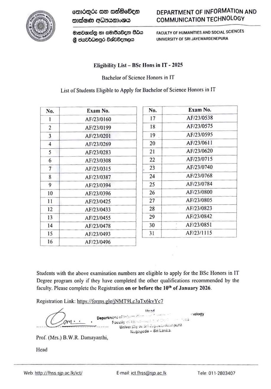 BSc (Hons) in IT – Eligibility List – 2023/2024 Batch List of Students Eligible to Apply for Bachelor of Science Honors in IT - 2023/2024 Batch Apply Now! fhssweb Previous post Opening of "The Kernel" ICT Laboratory December 31, 2025 You may also like Opening of “The Kernel” ICT Laboratory 4 December, 2025 Caps off to our AMAZING 2019/2020 batch! 24 October, 2025 Diploma in Information Technology 22 October, 2025
