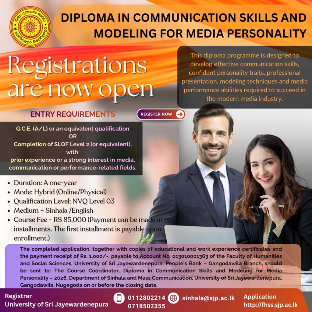 The rapid evolution of media platforms has heightened the demand for individuals who possess strong communication abilities and presentational charisma. Recognizing this industry need, the Department of Sinhala and Mass Communication has developed a focused diploma to nurture and empower emerging media personalities by combining communication theory, modeling techniques and real-world application.