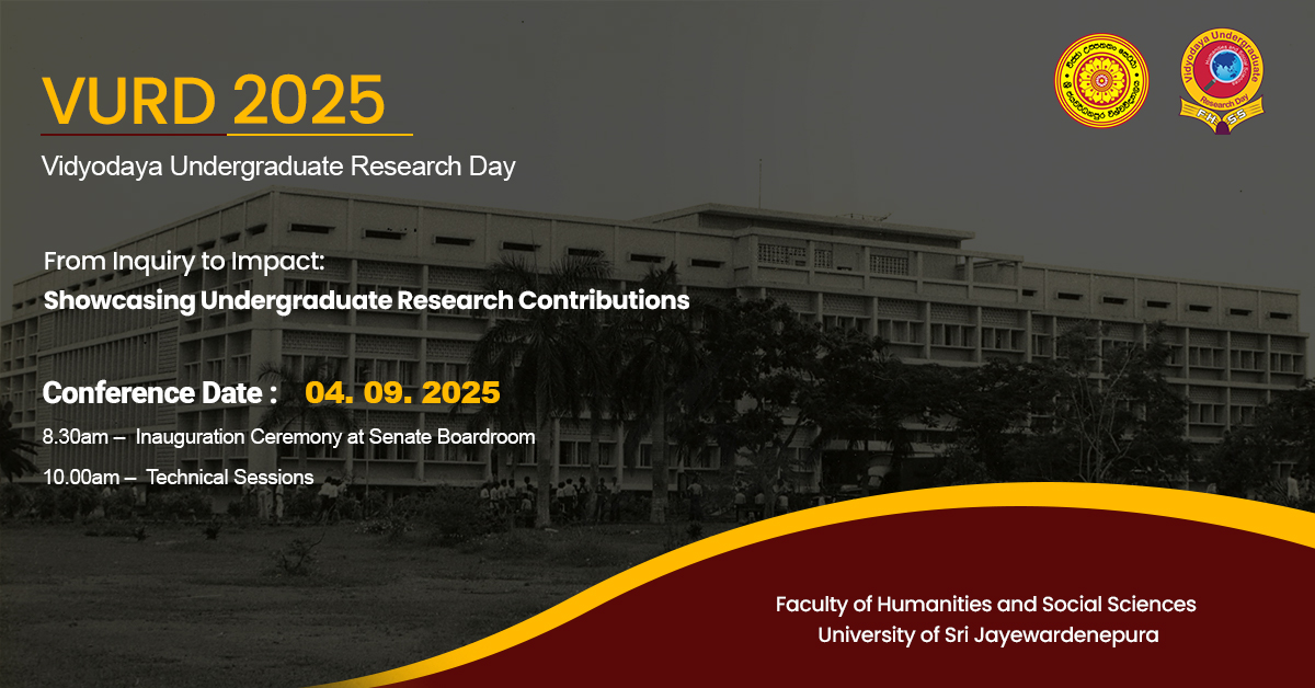 The Vidyodaya Undergraduate Research Day (VURD) is an annual event organized by the Faculty of Humanities and Social Sciences at the University of Sri Jayewardenepura. It serves as a platform for final-year undergraduates to present their research findings, fostering an environment of academic inquiry and scholarly exchange. The theme for VURD 2025 is “Knowledge in Practice: Research on Contemporary Issues in Humanities and Social Sciences”.